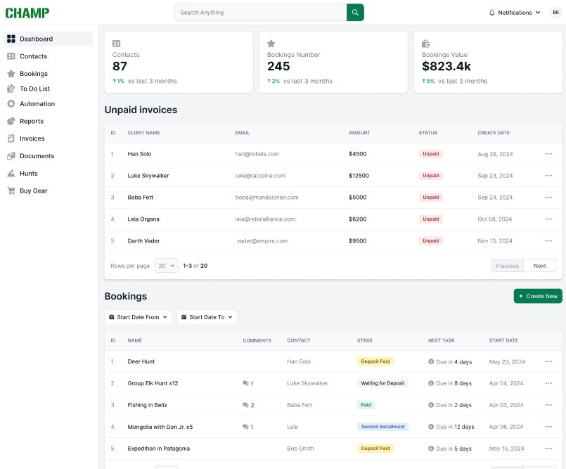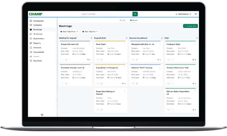 You and your team can follow the booking from deposit all the way through completed trip. Customize the stages your team uses for each booking.